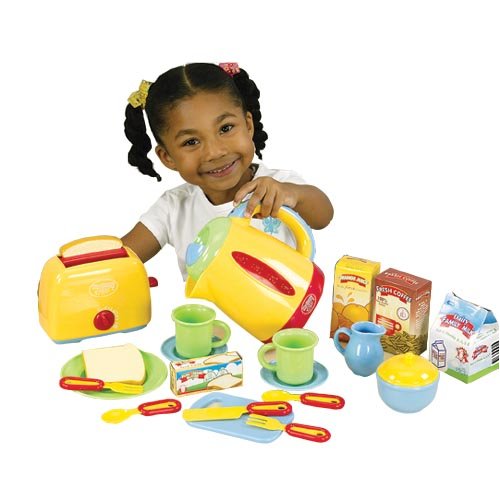 3 years up Set includes two slot toaster a cup and saucer set for two cream pitcher sugar bowl and more Set Includes a total of 23 pieces Requires 3 AA batteries not included 23 pieces Includes toaster cup saucer set pitcher sugar bowl and more Read More..