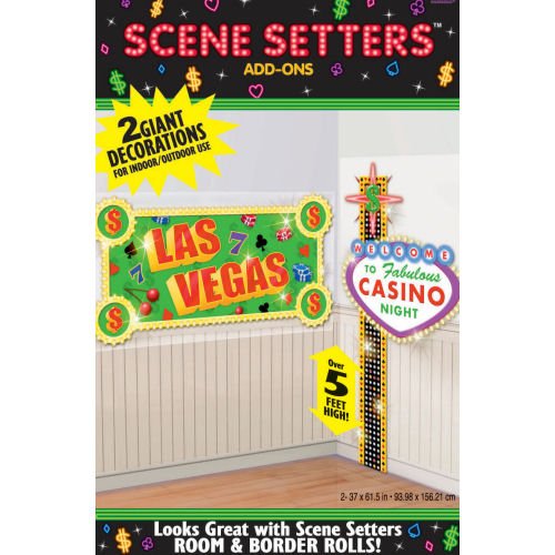Double your odds with these 2 giant Las Vegas Scene Setter Add-Ons Each package contains 2 Add-Ons that are over 5 long One reads LAS VEGAS and the other WELCOME TO FABULOUS CASINO NIGHT Use on a Casino Night room roll or on a bare wall Attach and remove easily with double-sided tape or tic Read More..